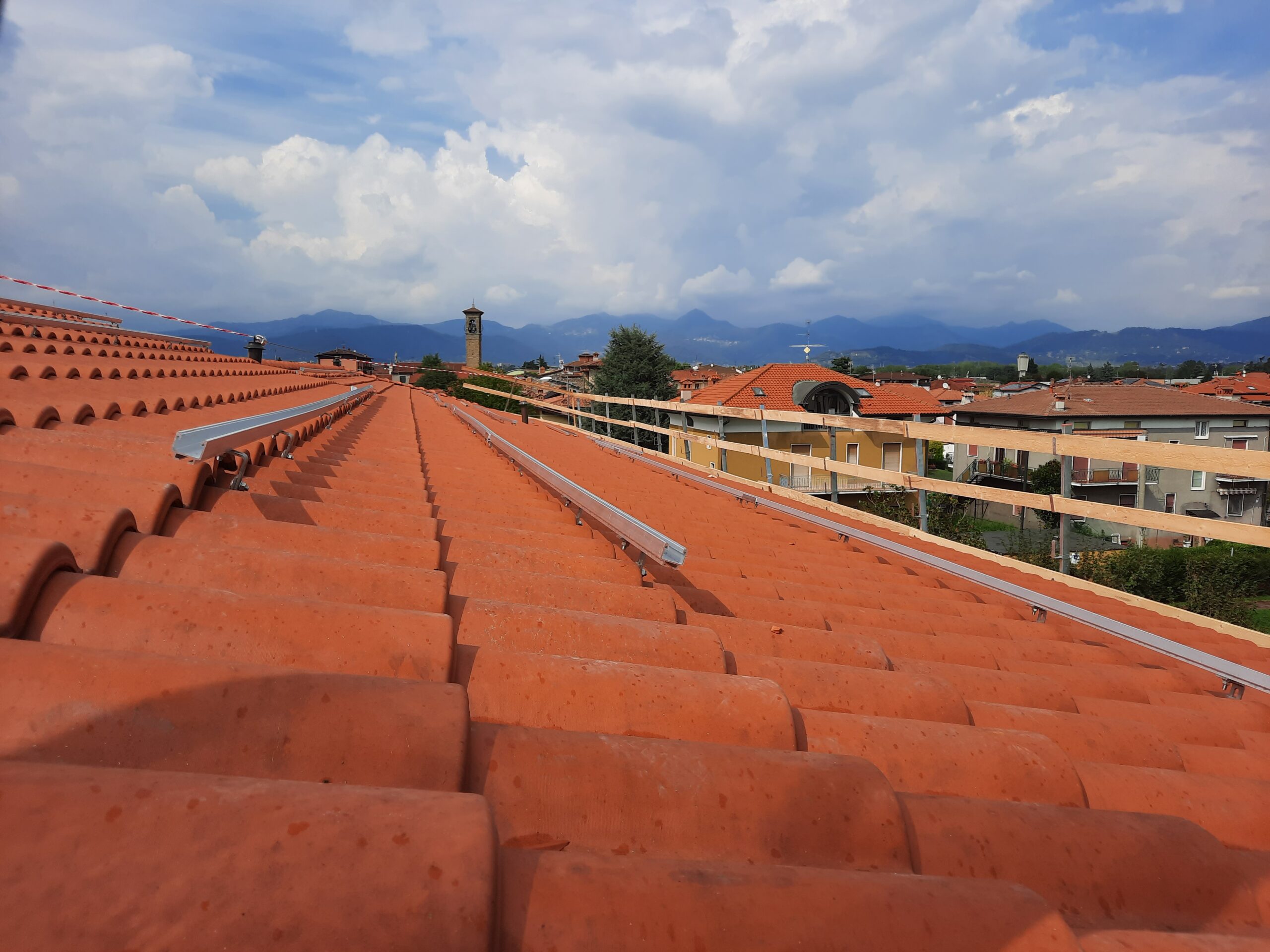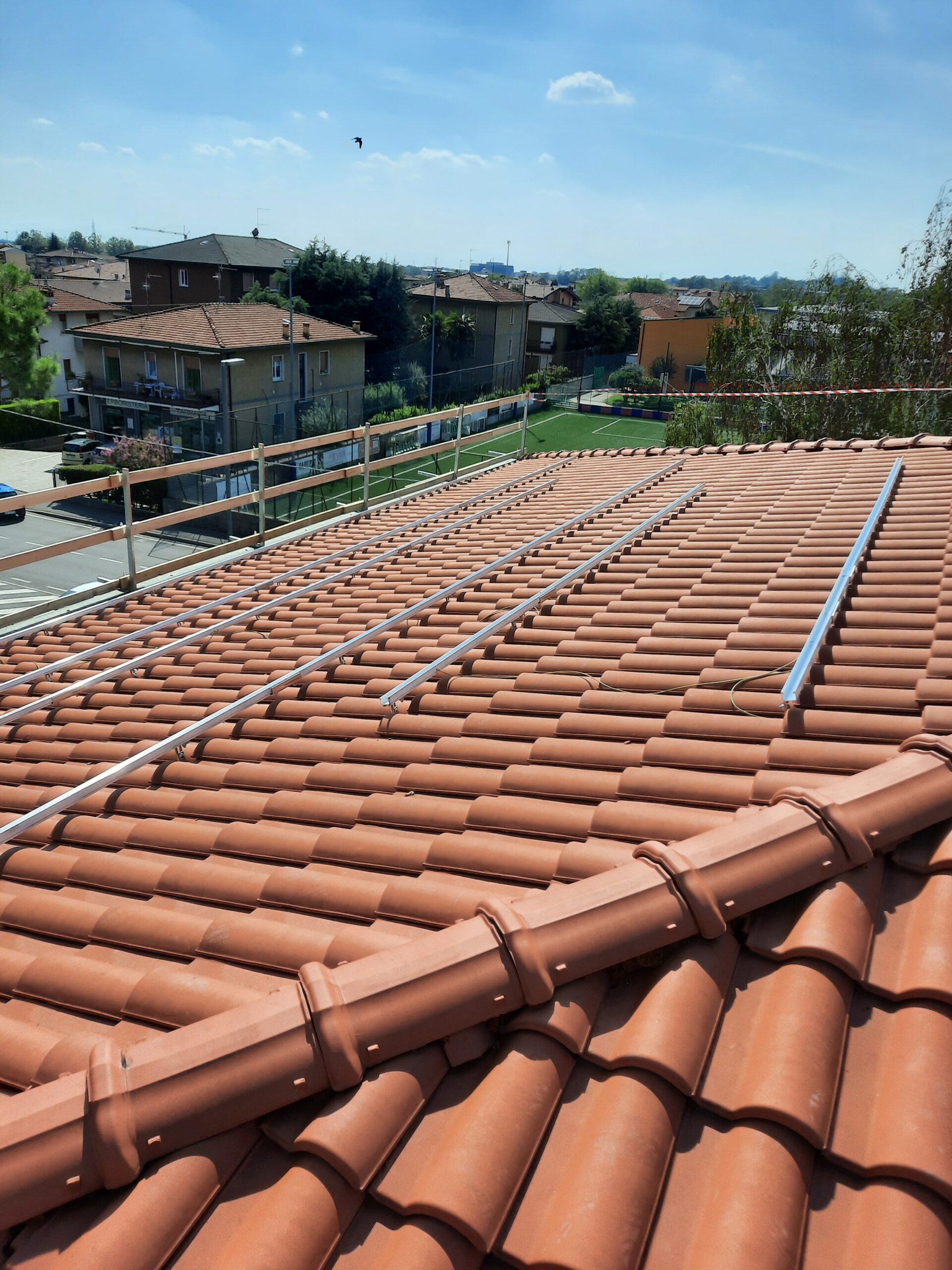 Impianto installato per il Comune di Grassobbio con moduli posizionati sopra l’edificio delle scuole medie adiacenti. Cantiere aperto durante anno di attività scolastica.